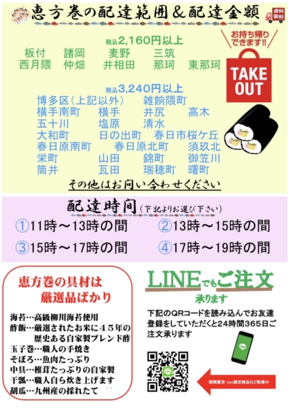 LINEでのご予約は365日24時間受付中です。(当日・前日・前々日のご予約は配達時間の空き状況等ございますのでお電話のみでの受付となります。)